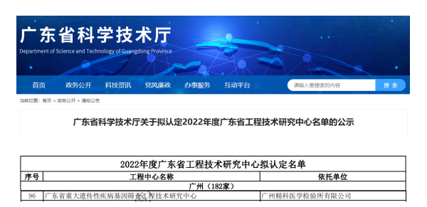2023年1月6日,廣東省科學技術廳發(fā)布《廣東省科學技術廳關于擬認定2022年度廣東省工程技術研究中心名單公示》,2022年度省工程技術研究中心名單正式揭曉,廣州精科醫(yī)學檢驗所有限公司赫然上榜,獲批“廣東省重大遺傳性疾病基因篩查工程技術研究中心”。