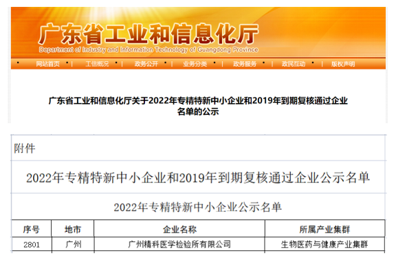 廣東省工業(yè)和信息化廳公布了《關于2022年專精特新中小企業(yè)和2019到期符合通過企業(yè)名單公示》。廣州精科醫(yī)學檢驗所有限公司成功通過省級“專精特新”企業(yè)認定,榮登“2022年廣東省專精特新中小企業(yè)”行列。